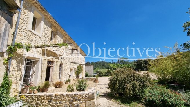 La maison principale est construite en pierre traditionnelle et offre 475m² de surface habitable. Elle est orientée au sud et donne sur un petit jardin et sur la cour formée par les bâtiments de production.